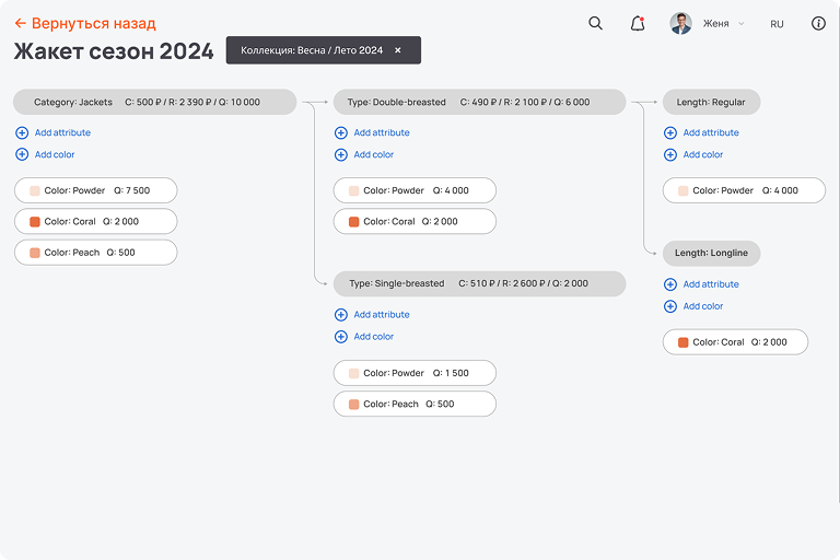 - Контролируйте все этапы работы над коллекцией от планирования до формирования графиков поставок готовых товаров в сеть.