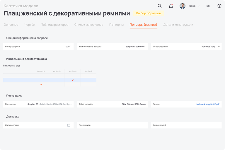 - Выбирайте материалы, сравнивайте коммерческие предложения от поставщиков и управляйте разработкой образцов.