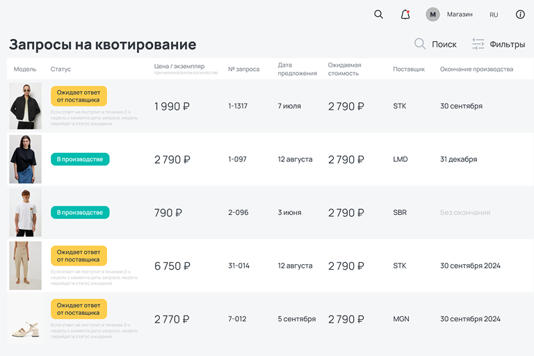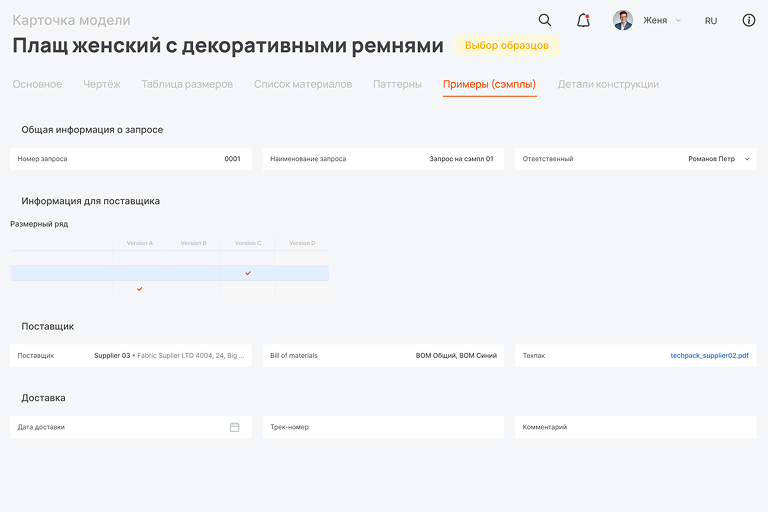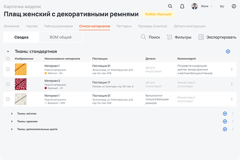 - Совместная работа в карточке модели всеми специалистами по разработке и производству коллекций.