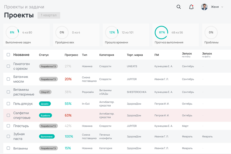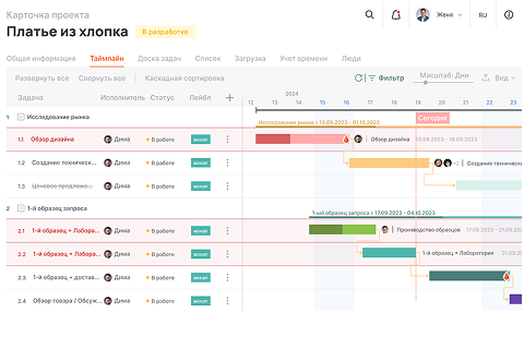 - Контроль сроков выполнения задач, планирование ресурсов и удобные переходы задач между отделами.