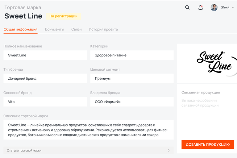 - Полный реестр зарегистрированных торговых марок, поддержка зонтичной структуры и связки с категориями.